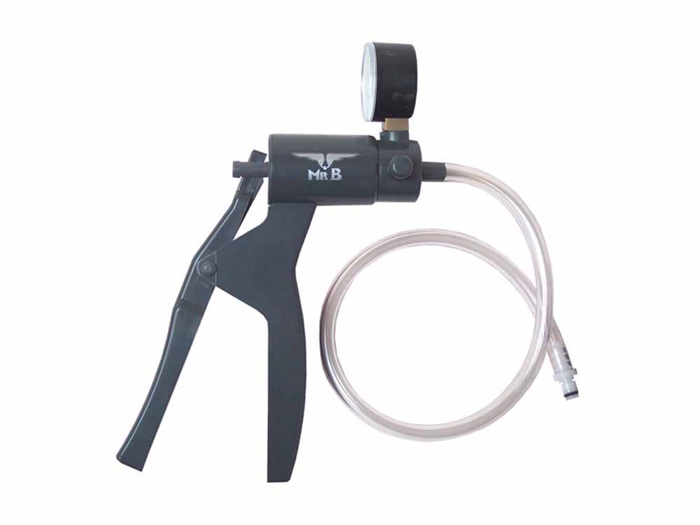 Eine Handpumpe aus hartem Kunststoff, die nur mit einer Hand bedient werden kann. So haben Sie die andere Hand frei um den Zylinder in Position zu halten.