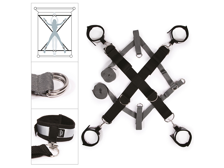 Erkunden Sie neue Stilrichtungen des Bondage-Spiels mit dieser Kreuzfessel, mit der Sie Hand- und Fußfesseln sowohl vertikal als auch horizontal positionieren können. Der Deluxe Upgrade eines klassischen Fesselsystems, inspiriert von den Fifty Shades of Grey Büchern.